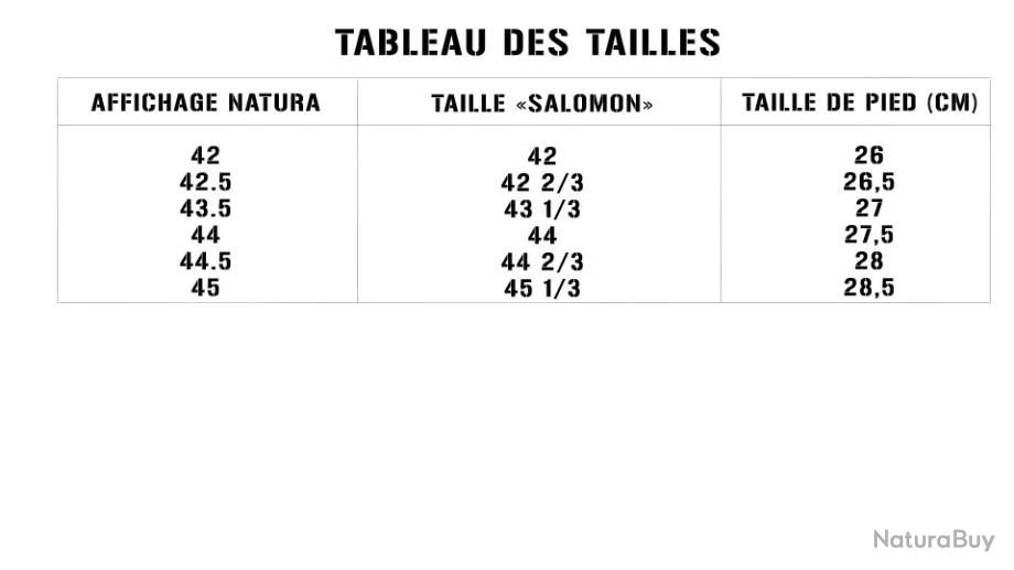 Attention Natura ne proposant pas le taille « salomon » merci de bien prendre en compte le tableau des tailles ci-dessous avant de commander :